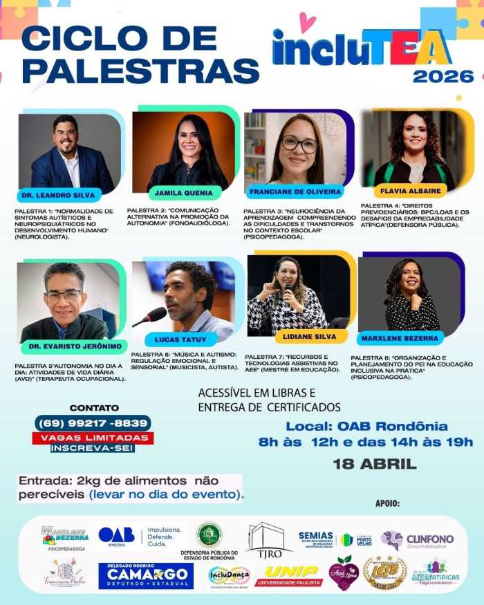 Mais do que um momento de aprendizado, o evento propõe reflexões profundas. / Banner de Divulgação No dia 18 de abril, no auditório da OAB/RO, o evento reúne palestras, serviços gratuitos, espaço kids e feira de empreendedorismo, promovendo inclusão, conhecimento e acolhimento. Esta terceira edição do IncluTEA traz o tema: “Autonomia se constrói com respeito e inclusão: decisões e escolhas que transformam vidas.”