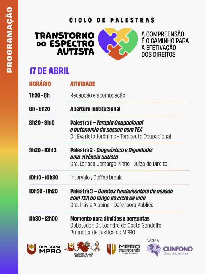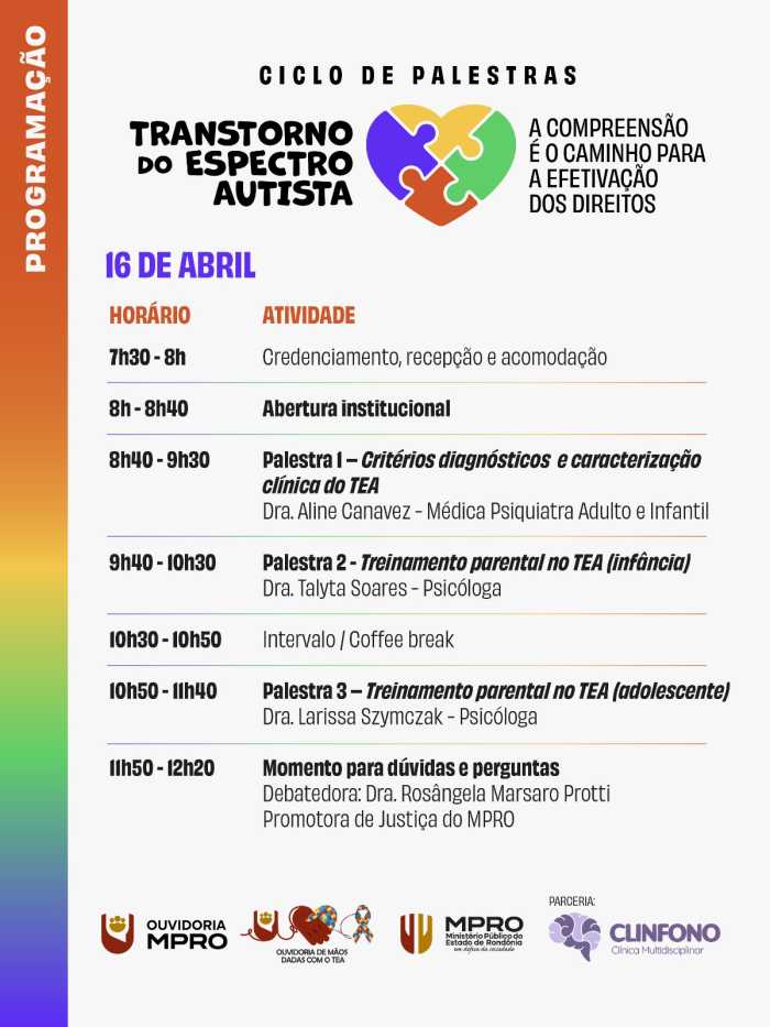 A programação reúne profissionais da saúde, do Direito. / Divulgação Nos dias 16 e 17 de abril de 2026, o Ministério Público do Estado de Rondônia (MPRO), por meio da Ouvidoria, realiza um Ciclo de Palestras sobre o Transtorno do Espectro Autista (TEA), com o tema: “A compreensão é o caminho para a efetivação dos direitos”.
